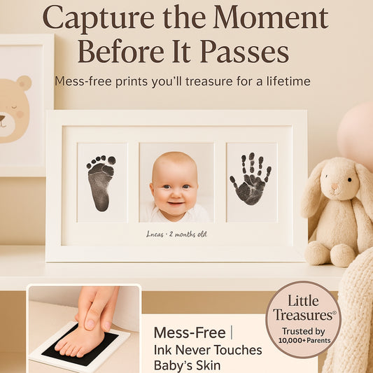 Try to capture prints when your baby is calm, sleepy, or after feeding. Have a helper gently hold the hand or foot, lay the card flat, and press the pad evenly for 1–2 seconds. A quick practice on a spare card also helps!