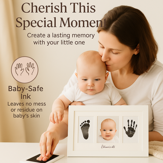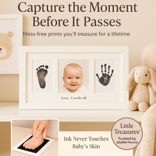 Our Clean-Touch Ink Pad allows you to capture your baby’s handprint or footprint without ink ever touching their skin. The print comes from a thin film that transfers ink onto paper while your baby’s skin stays clean. It’s acid-free, non-toxic, and sized for most newborns.